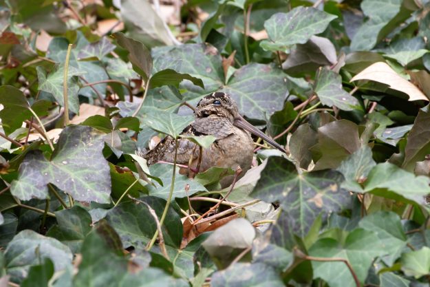Nearby, in Bryant Park, an American woodcock stands apart. Her little body, dappled brown and patterned like a snake, is the size of my fist. Her beak is flamboyantly long, jutting out beyond a rounded chest. She sways in a slow, rhythmic dance, eyes dark and bright as a sky, studded with stars. People watch quietly, attentive and in awe.